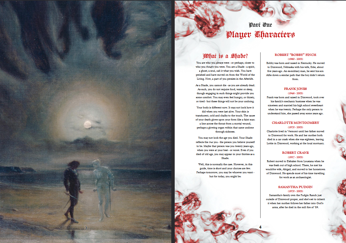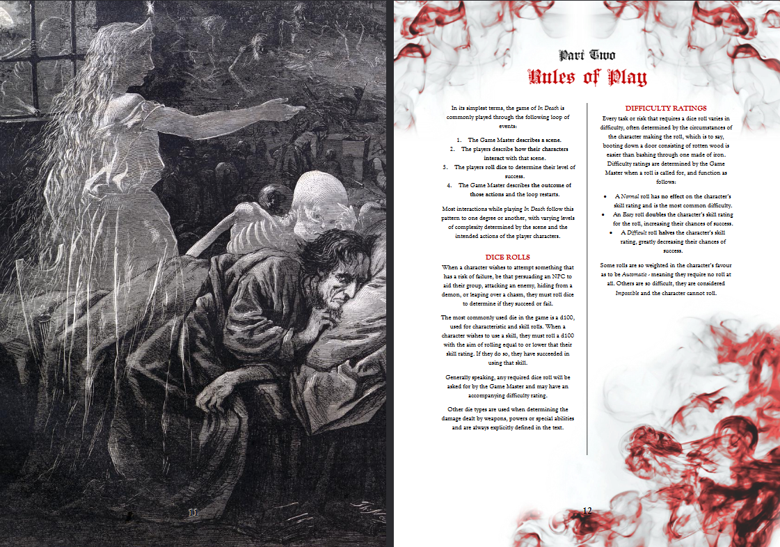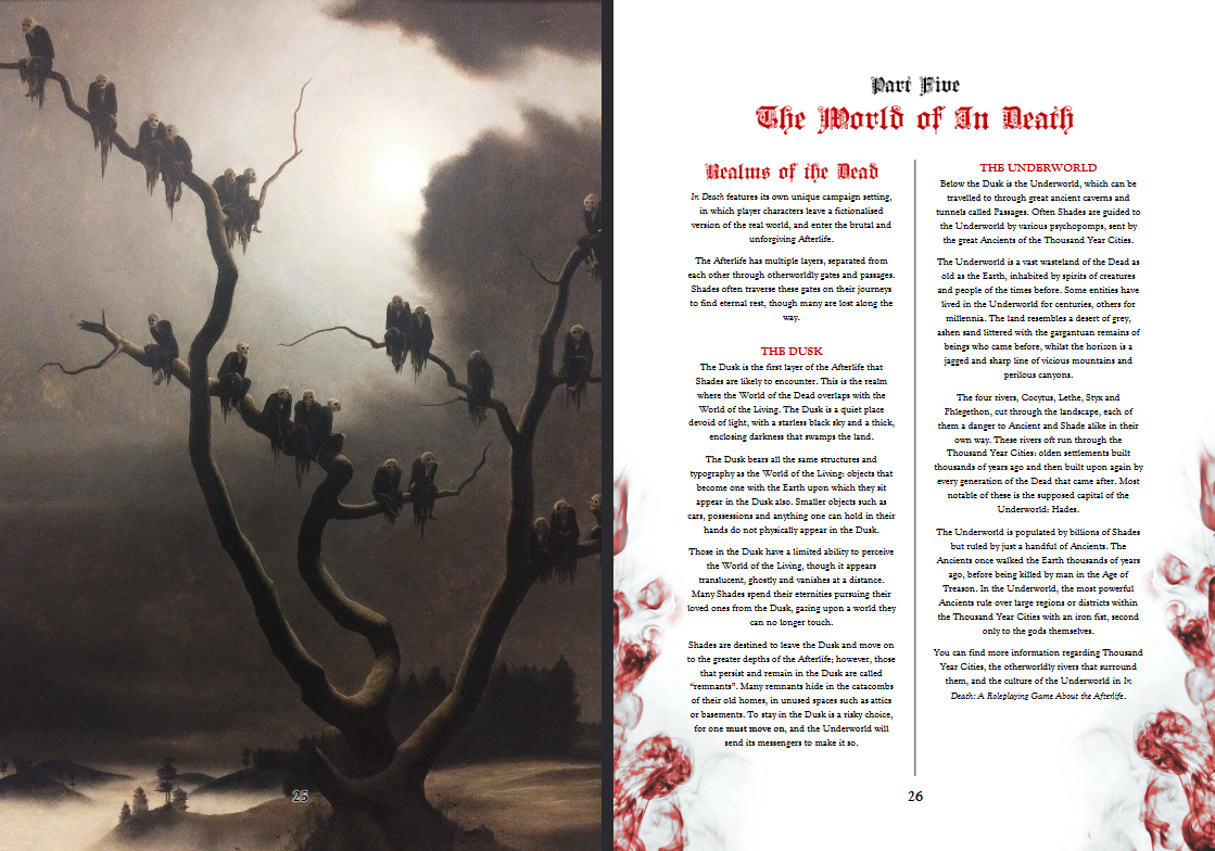 In Death is a roleplaying game designed for character-driven stories which tackle mature themes, with built-in flexibility for genre play. From solving your own murder, to cutting a path through the Underworld to find a place of rest - In Death can tell stories of all kinds - but only if you're dead.