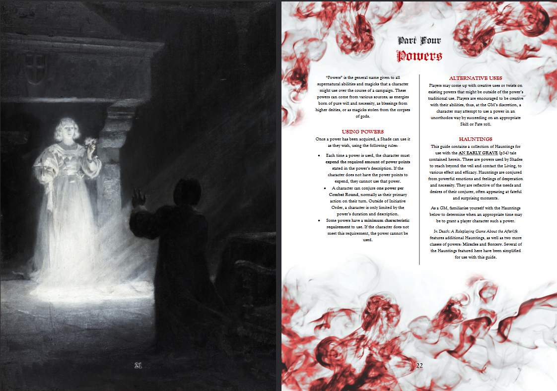 In Death uses Chaosium's d100 Basic Roleplaying System and placed as a finalist in the 2024 Basic Roleplaying Design Competition. The game uses unique mechanics such as a shade's Flesh and Soul to determine their strength in the Afterlife and their ability to reach out and affect the Living. With three unique power types: Hauntings, Miracles and forbidden Sorceries, explore the Afterlife, meet shades from eras gone by and the powerful, extinct beings dismissed by the Living as mythology.